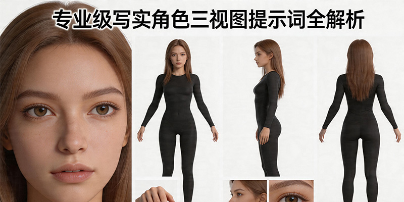 本文将以一段专业的“写实角色三视图提示词”为核心案例,为你进行深度的逐行解析。我们将从摄影级光照设定(如次表面散射)、构图逻辑(面部特写与三视图布局)以及细节约束(A-pose与特征锁定)三个维度,剖析这段文字为何能生成高质量的商业级设计稿。